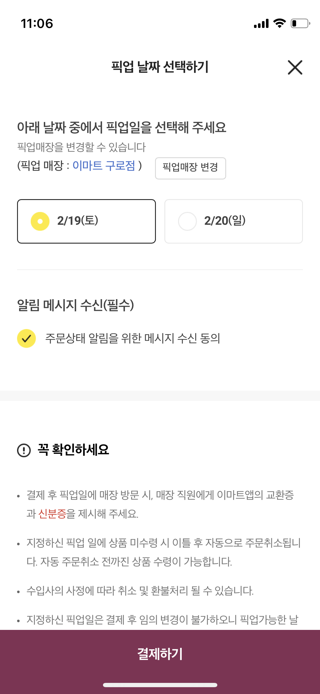 매장 컨디션에 따라서 픽업이 불가능 한 곳도 있으니 픽업이 가능한 지역의 이마트 여러 지점을 검색해 보시면 좋아요.