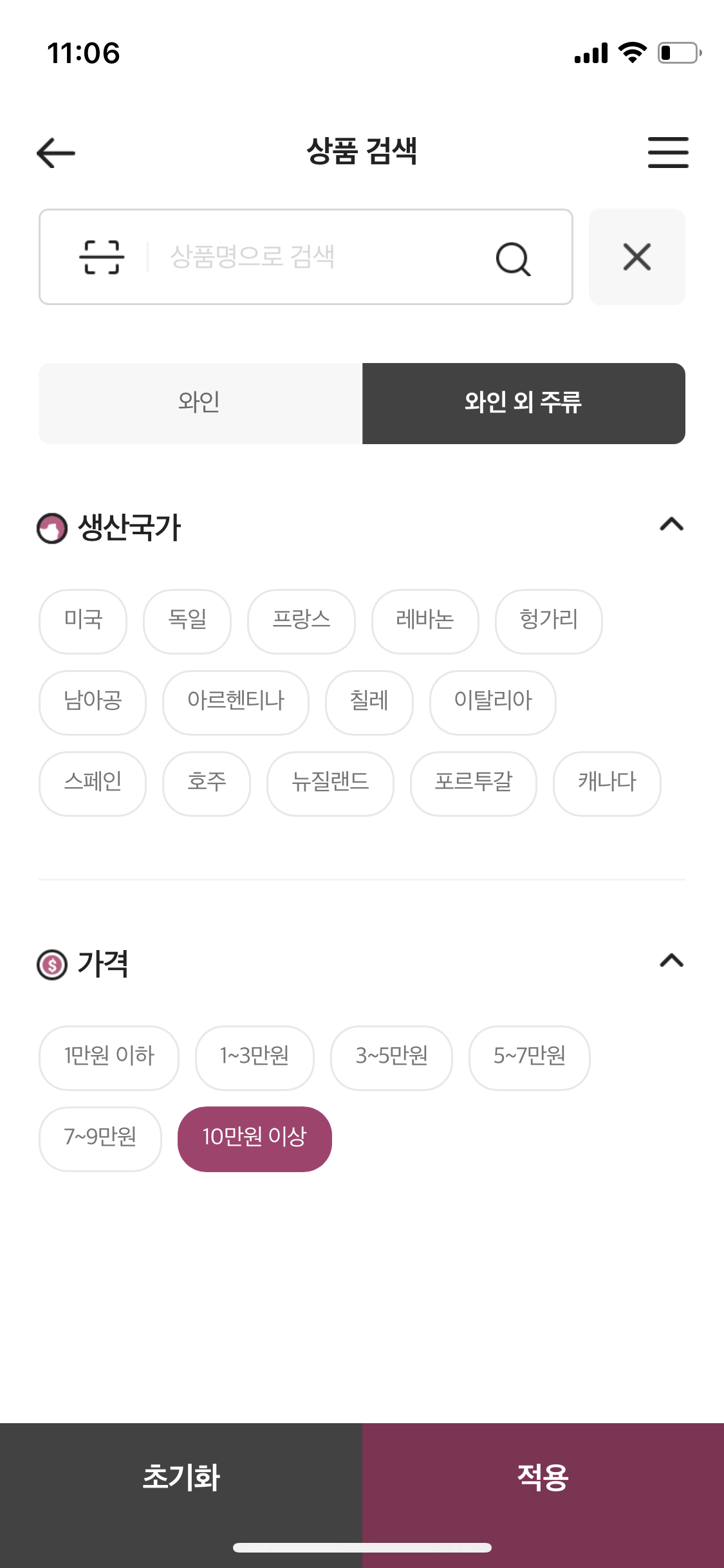 중간에 보이시는 상세검색 버튼은 통해서 와인을 포함한 다양한 주류를 검색할 수 있어요.