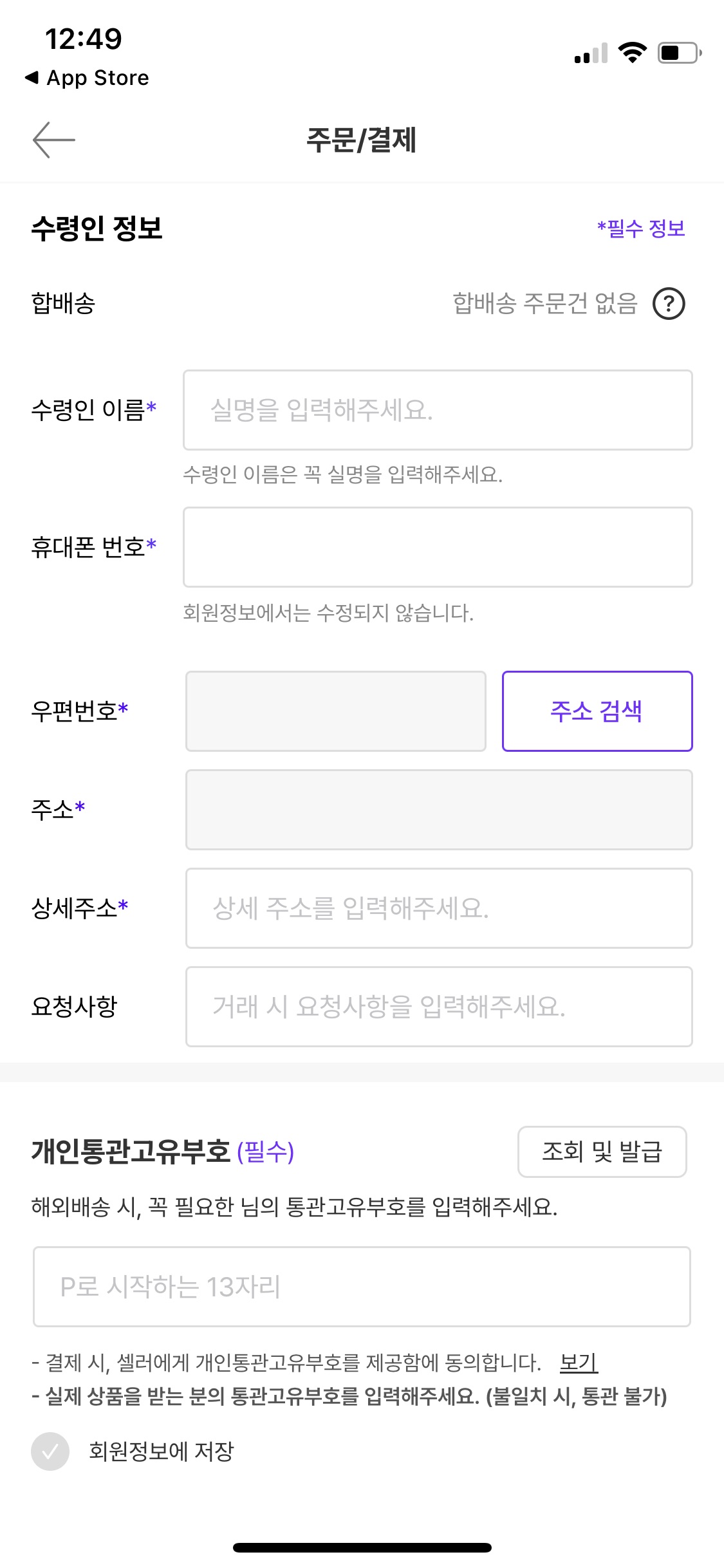 특히 가장 아래 쪽에 보이는 개인통관고유부호는 필수 입력입니다.